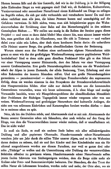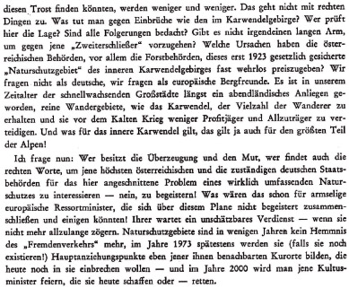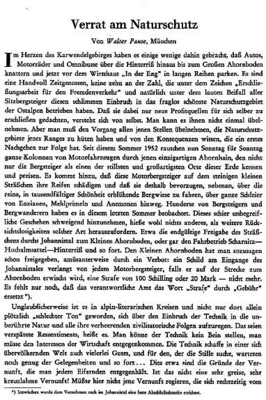 von Scharnitz nach Pertisau? Der Ausbau des vorher unberührten Isarursprungs zu einer banalen Gartenbauausstellung und der ausufernde Taxiverkehr in die Karwendeltäler sind einem Naturschutzgebiet nicht angemessen. Auch Forst und Jagd tragen zu dieser unheilvollen Entwicklung bei. Forst- und Rückewege bis in die Hochlagen zerstören die empfindliche Humusauflage und das für den Waldboden lebenswichtige Pilz- und Bakteriengeflecht. Erosion und erhöhter Wasserabfluß sind die Folge. Eine natürliche Waldverjüngung kann wegen des zu hohen Wildbestandes und dem daraus resultierenden Verbiss nicht stattfinden. Anfällige Fichtenmonokulturen und sanierungsbedürftige Bergwälder sind die Folge. Es sollten nur Hauptrouten und Übergänge markiert und beschildert werden. Der Reiz der Hochgebirgslandschaft liegt doch gerade in ihrer Unberührtheit. Völlig überdimensionierte Markierungen, die vom Gipfel aus durch das ganze Kar erkennbar sind, banalisieren das Erlebnis der Naturlandschaft. Vielleicht könnten DAV und ÖAV ihre Wegebau- und Markierungstrupps in Zukunft etwas mehr im Zaume halten. Wenn wir jetzt nicht zum Umdenken anregen und motivieren, wird